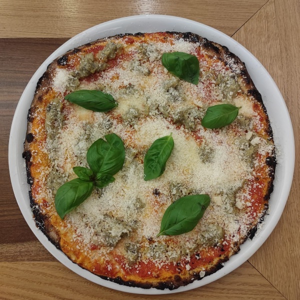 Pomodoro fatto in casa, fior di latte, melanzane cotte al forno e marinate, Parmigiano Reggiano Dop 24 mesi e basilico.