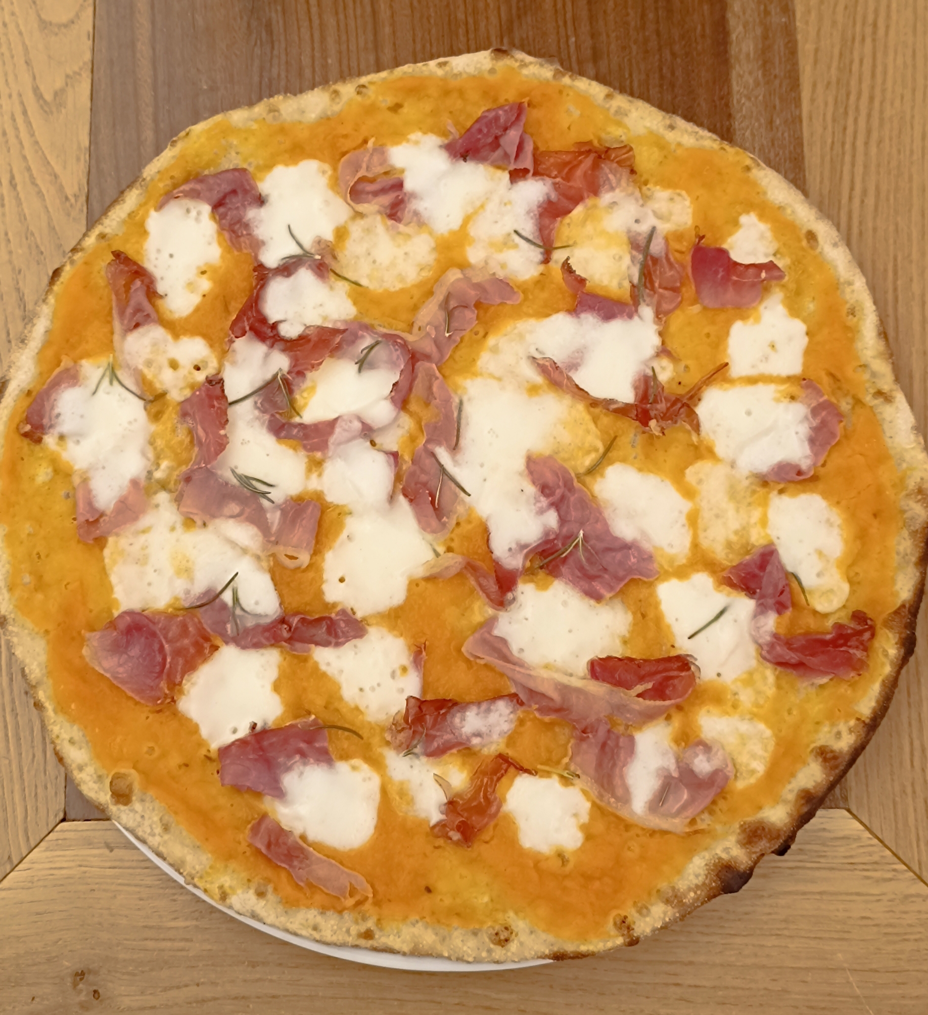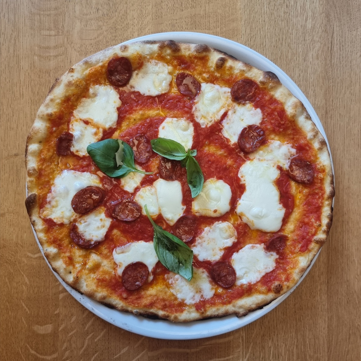 Fior di latte di Raiano, salsa di pomodoro fatta in casa, salame piccante artigianale.