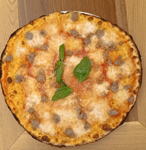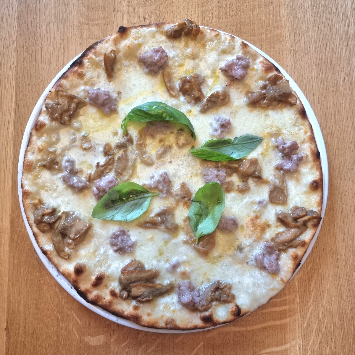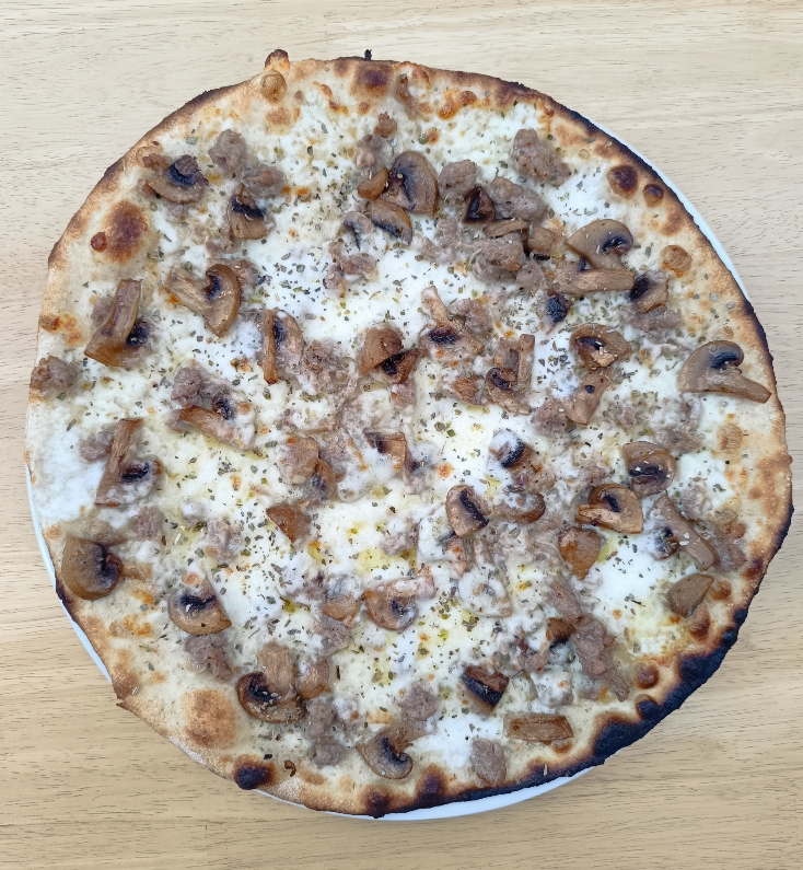 Fior di latte, funghi champignon, salsiccia artigianale e origano.