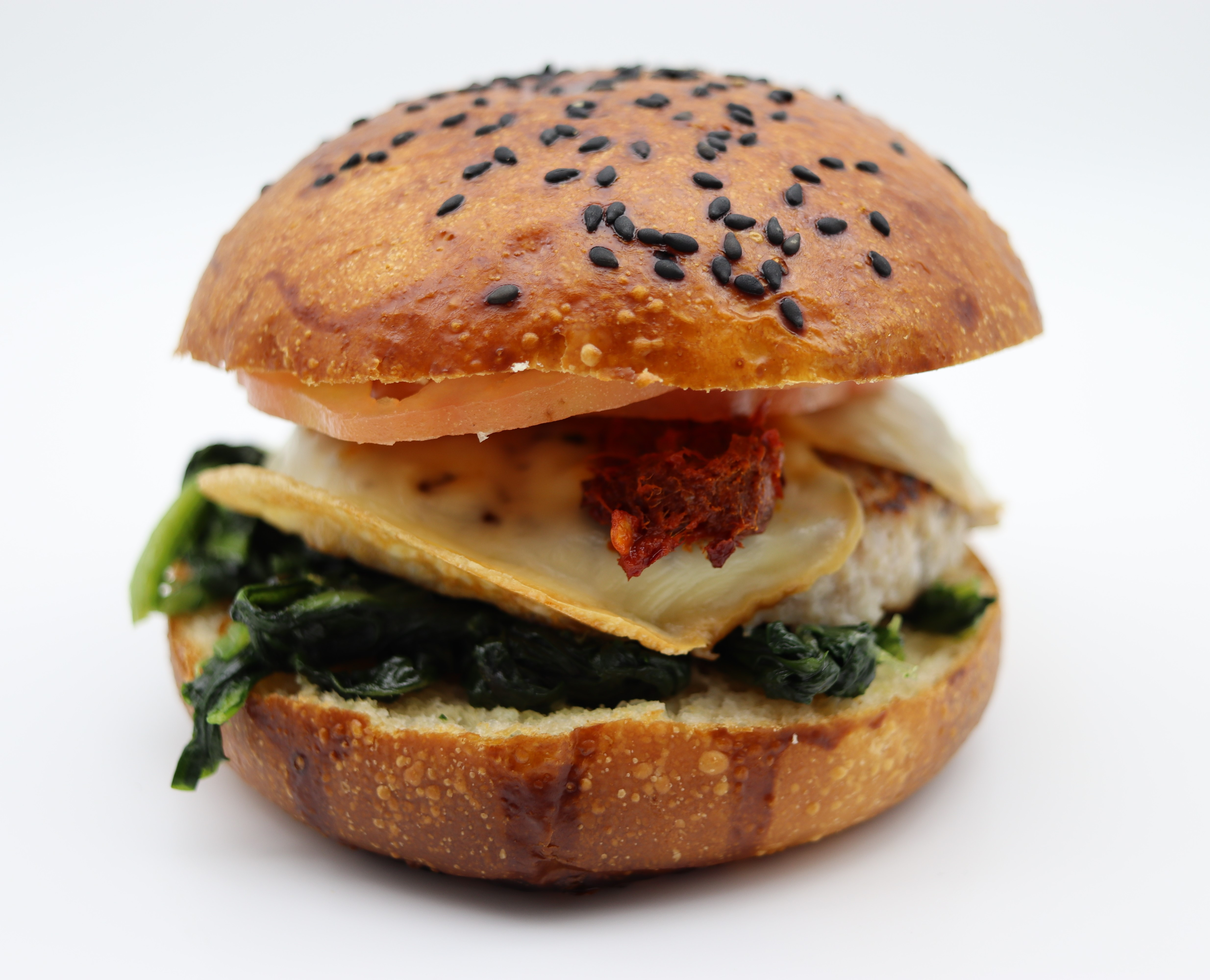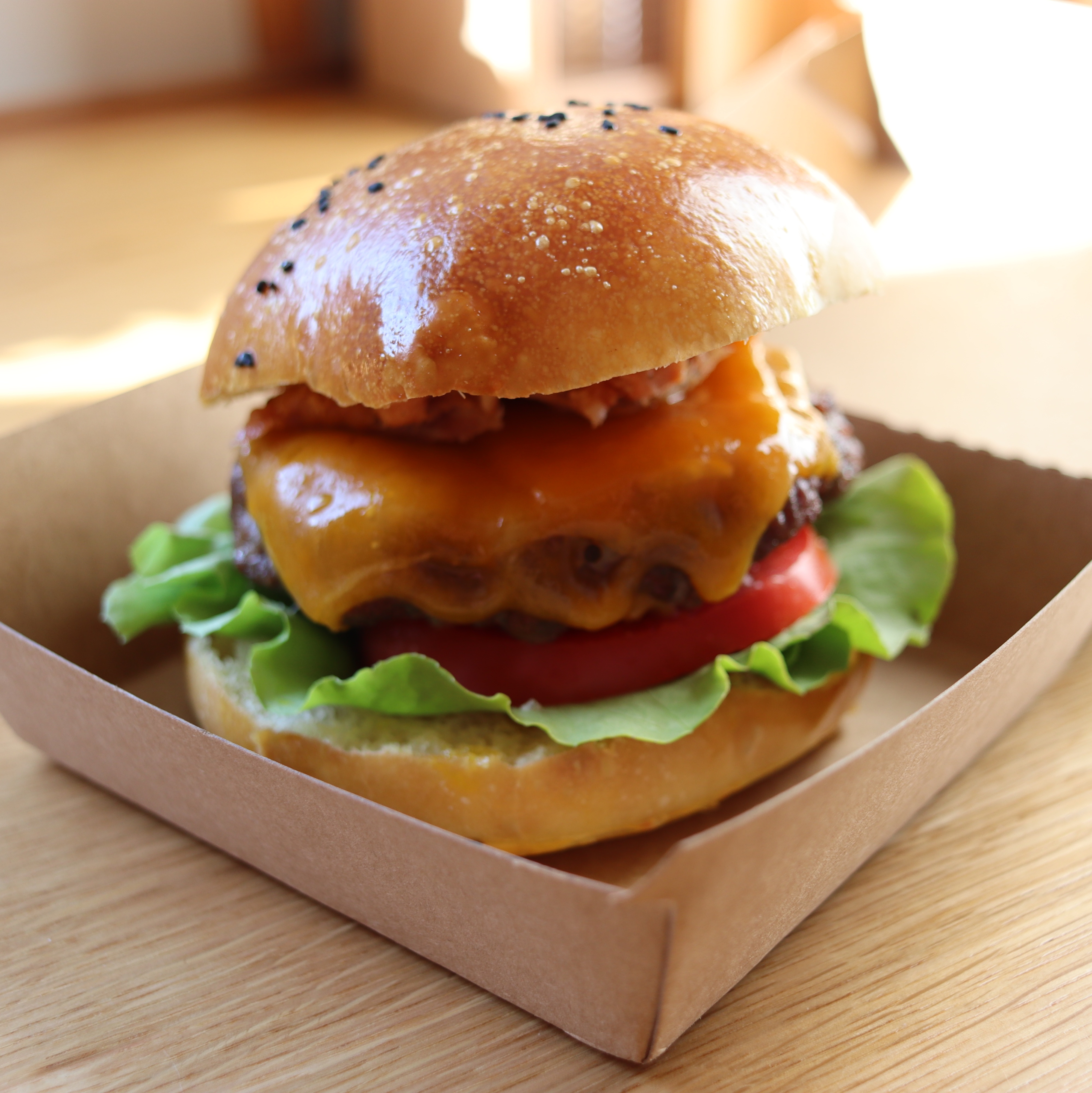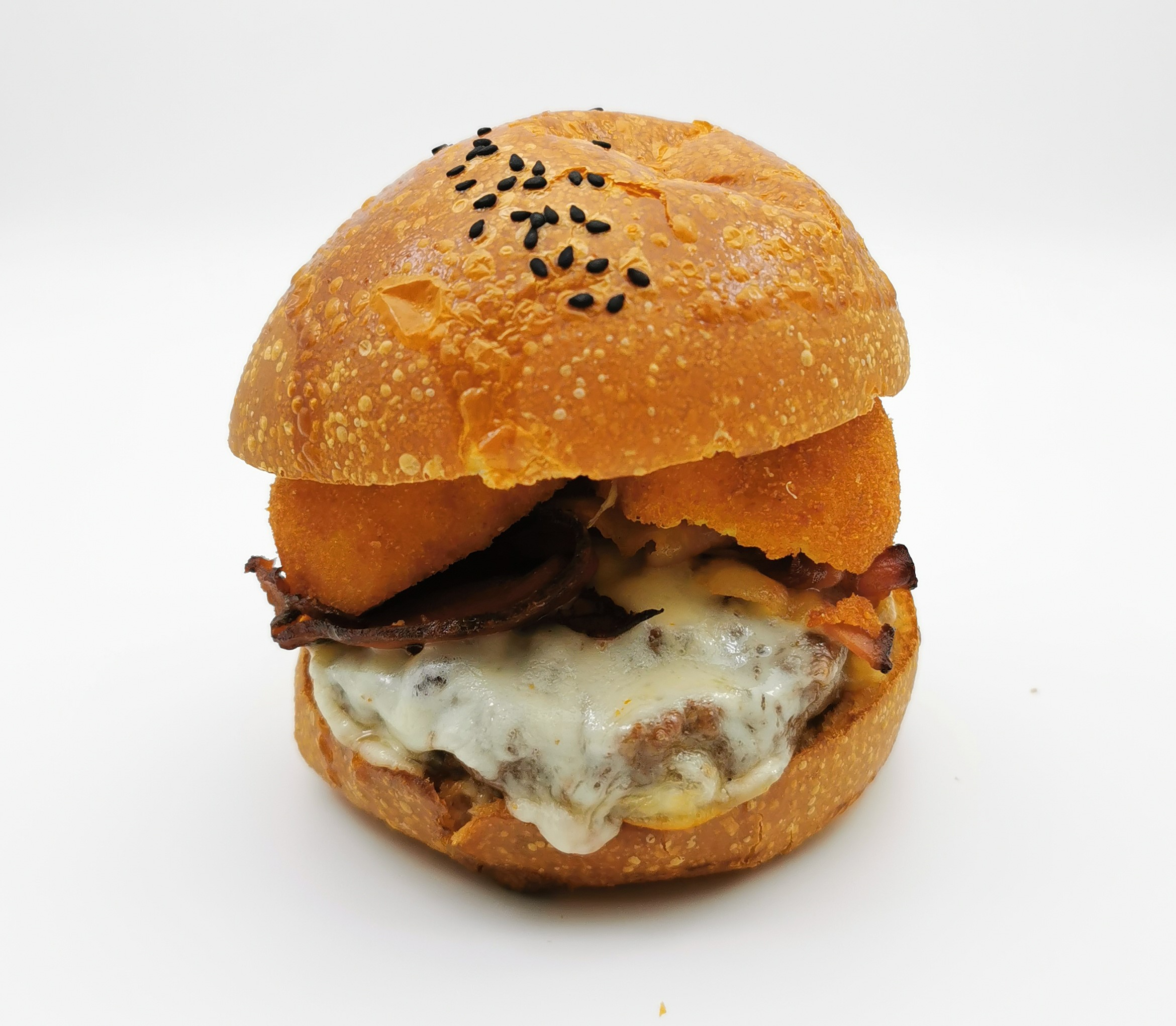 Cipolla, pancetta croccante, pomodoro, lattuga, cheddar, cetriolino sott'aceto, macinato di angus con il pane fatto in casa.