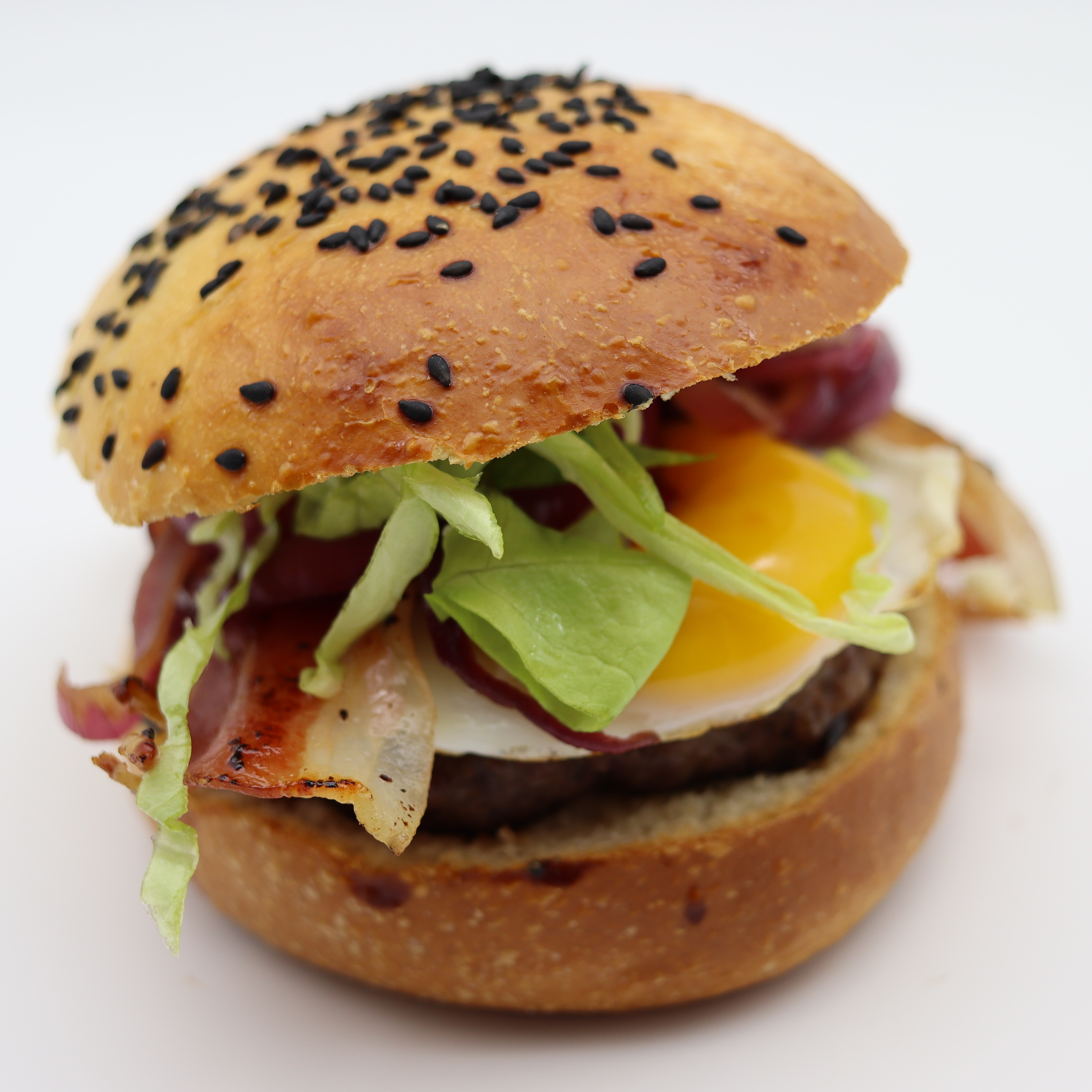 Uovo, cheddar, lattuga, cipollina rossa, pancetta artigianale croccante, macinato di angus con il pane fatto in casa.